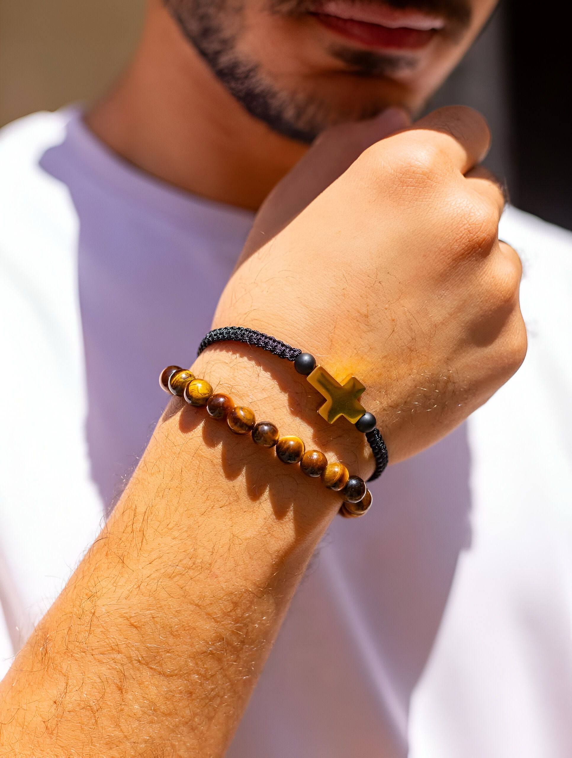 The Golden Cross Cuff brings a bold yet minimalist edge to your wrist. With a brushed yellow stainless steel cross bead anchored on a sleek black macrame band, it’s a modern emblem of faith, resilience, and confidence. Durable, adjustable, and made to stand out in any setting.